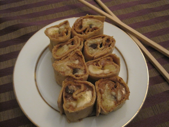 I will so be trying this dessert sushi. I love bananas (thank goodness, cause it’s about the only fruit I like) and chocolate chips. But I’ve never tried almond butter. I’m such a newbe to this stuff. Anyway, it looks delicious!