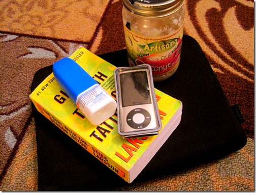 Laptop, book, iPod, allergy nasal spray, and coconut butter. I have my priorities straight.