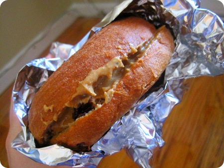Thankfully my food-less kitchen was recently filled with some new goodies from Udi’s, so I was able to throw together a peanut butter bagel sandwich for the road rail.