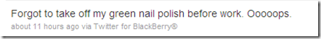 Green nail polish- probably depends what type of job. I’m in a laid-back, marketing position so I could get away with it. Conservative office environment…eh, not so sure.