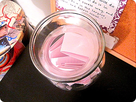 i used to have a quote jar all through high school where i did the same thing!! and then i even started finding cute little antique jars and filling them with inspirational quotes/verses to give to friends as well.