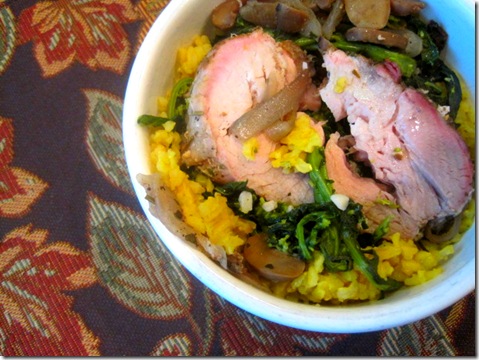 Serve with a vegetable and a grain, which in our case was sauteed broccoli rabe and brown rice. Per. fect. ion.