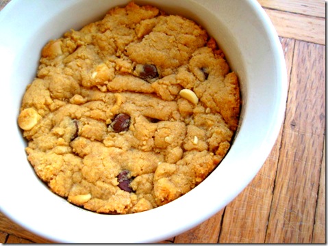 directions: Preheat oven to 350 degrees. In a large-ish bowl, combine cake mix and chocolate chips. In another bowl, whisk together peanut butter and milk. Add wet ingredients to the dry ingredients and combine well. **The result will be more like a cookie dough than a cake batter.** Place dough/batter into a greased 6-inch diameter ramekin. Bake for 20 minutes.