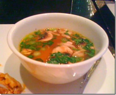 I started with their Chicken Tom Yum soup (savory sour soup with mushrooms, traditionally seasoned with lemongrass, kaffir lime leaves, chili and lime juice). Loved this – lots of great flavors going on.