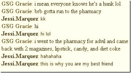 Haha I haven’t used AIM for years! I gchat allll the time though but hate Facebook chat! Umm I’m the same way whenever I got to Walgreens or CVS- I always come out with a magazine, mints and a drink! I think of it as a little reward for having to go to the drugstore!