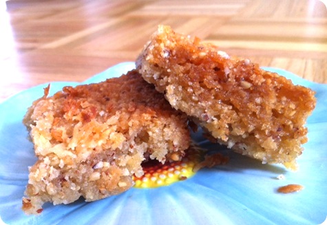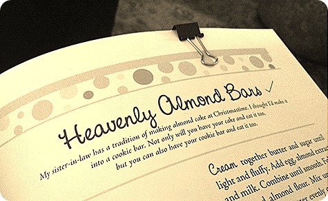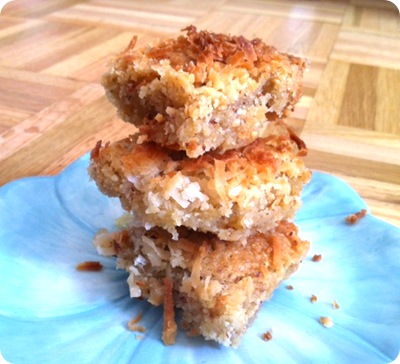 * I actually forgot to add the milk, but they (thankfully) still turned out fine. I also used coconut extract instead of almond extract and topped the bars off with 1/3 cup shredded sweetened coconut instead of almonds.