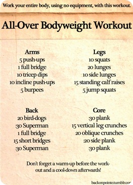 Monday: I started working out again! Like, for real this time. I’ve been going to the gym, but was very inspired by these simple-ish routines found via Pinterest.