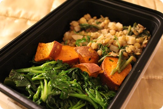 Lentil stew with mint and lemon, broccoli di cicco, sweet potatoes.