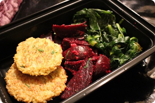 Quinoa-cauliflower patties, beets with walnuts and garlic, tat soi.