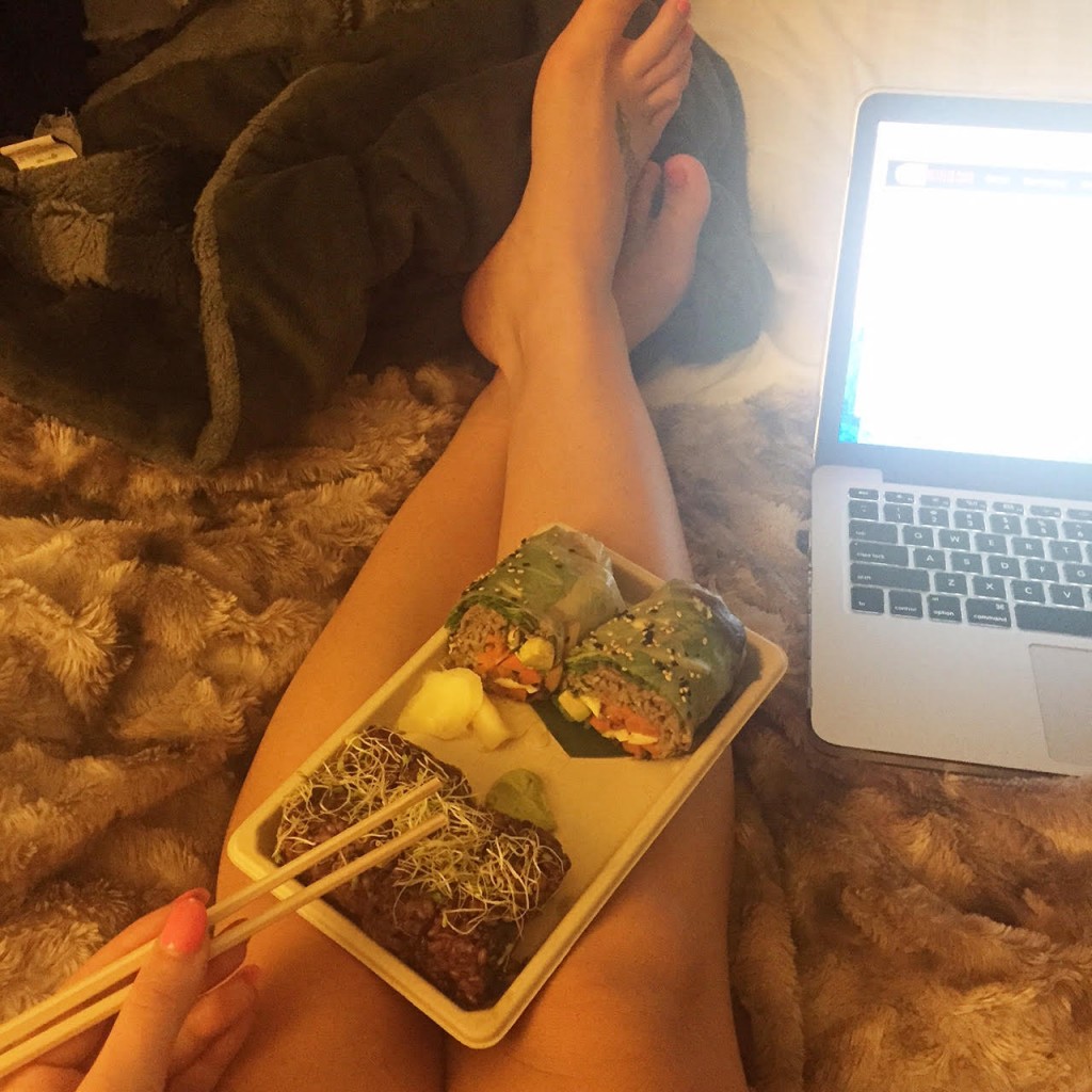 8pm - eat dinner in bed while watching Suits (my new TV show obsession). I ordered from Beyond Sushi.