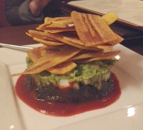 Guacamole Timbale – poblano-guacamole, chipotle black beans, jicama-cucumber salsa, plantain chips, ranchero sauce.