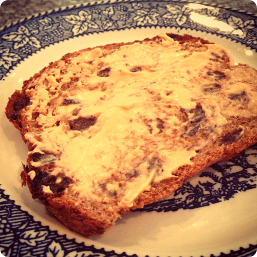 A slice of cinnamon raisin Ezekiel bread topped with pumpkin cream cheese.