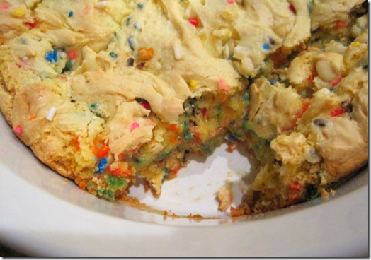 directions: Preheat oven to 350 degrees. Combine the cake mix and sprinkles in a large bowl, then mix in the oil and egg. Add the milk slowly just until the batter is combined – you want it to remain as dense as possible. Place better in a greased 8×8 pan or 8-inch cake pan. Bake for 25-30 minutes or just until the edges turn golden. Let cool for 20 minutes before cutting because the gooey center needs to set. The result will be a decadent, cake-batter texture.