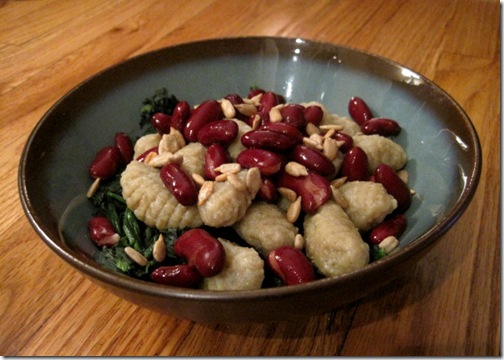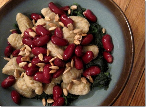 That would be a bowl layered with spinach, butter, whole wheat gnocchi, kidney beans, and salted sunflower seeds. Weird combination – maybe – but it worked.