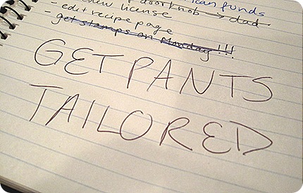 I love writing notes out but I am also a big to do list girl and love love love my own writing (how vain). Now, GO GET THOSE PANTS fixed! Then you can rock those adorable shoes and have them be seen. Cute.