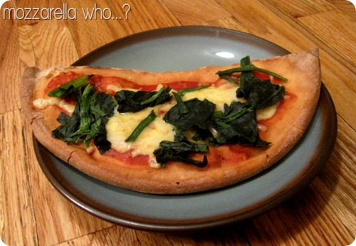 Behind door number one we have a traditional pizza of sorts – topped with garlic, tomato sauce, mozzarella cheddar cheese, and spinach.
