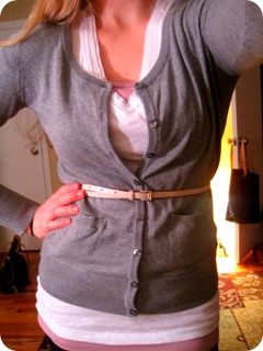 [Sweater and belt – H&M. Jeans – TJ Maxx. Tee and tank – Urban Outfitters. Flats – Target.]