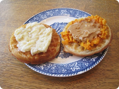 I need that sandwich in my mouth right now. WAFFLE lovin right there. Waffles with peanut butter is good. Waffles with peanut butter and banana is great. Waffles with peanut butter, bananas and SWEET potatoes is a whole new kinda food high.