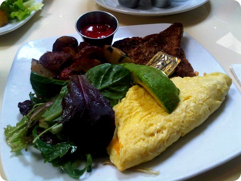 For my meal I got a cheddar and avocado omelet. It came with home fries, toast, and a small field green salad.
