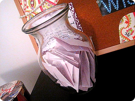 i used to have a quote jar all through high school where i did the same thing!! and then i even started finding cute little antique jars and filling them with inspirational quotes/verses to give to friends as well.