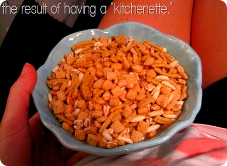 Kitchenette, hmm? Next summer I might be living somewhere that has one of those. I assumed I would like on ramen and microwavable meals from trader joes.