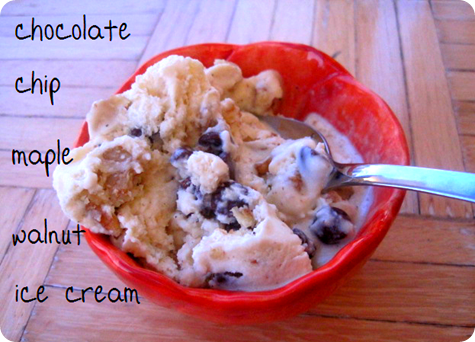 Let the ice cream sit out in a bowl for a few minutes until it softens. Mix in the maple syrup until well combined. Then mix in the walnuts and chocolate chips. Place back in the freezer for at least 15 minutes.