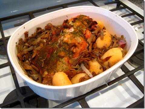 directions: Preheat oven to 350 degrees. Combine all of the seasonings in a small bowl, and then apply the mixture to every surface of the pork loin. Place roast in a shallow pan with the mushrooms, onions, and potatoes surrounding it (don’t put them on top of the roast). Place in oven and bake for 60-75 minutes, or until the center of the roast reaches 150 degrees. Let sit for at least 15 minutes before slicing.