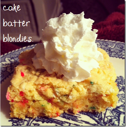 My “recipe” for Cake Batter Blondies – one that I sort of randomly came up with last year – has become the most-visited post on GML. I say “recipe” because it’s almost too simple to be considered such…yet to this day it’s the treat that I find craving more than almost anything else.