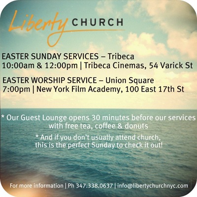 Speaking of church, if you’re in New York and looking for somewhere to go this Easter Sunday, you should definitely visit Liberty Church. I’ll be at the 7pm service, so let me know if you’d like to come and I’ll save you a seat 🙂