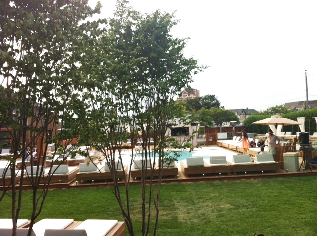 The pool area is right in the center of the hotel and surrounded by comfortable cabana-like lounge chairs.