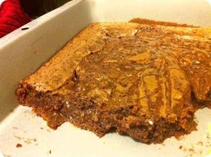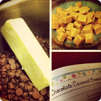 I followed the recipe for Chocolate Caramel Brownies from 101 Gourmet Cookies for Everyone. And they went. Fast.