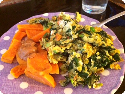 Despite being all over the place, I’ve been making it a point to (try to) stay fueled with nutritious meals. In this case, a veggie and egg scramble with a side of almond butter-topped sweet potato.