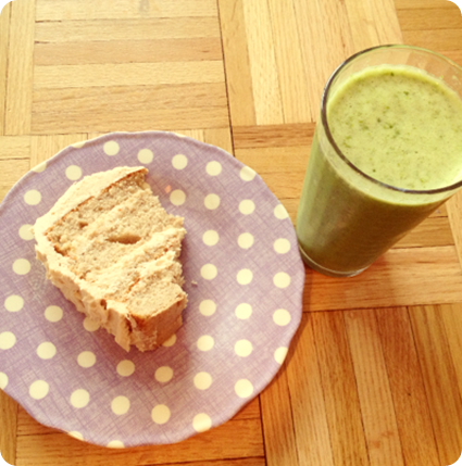 I enjoyed my cake for breakfast with a green smoothie because, well, that’s what bloggers do.
