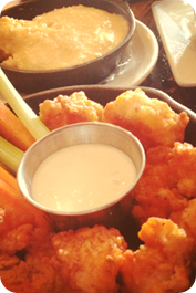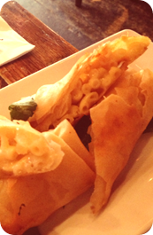 That would be cheese grits, buffalo shrimp, pulled pork quesadillas, and bacon mac ’n cheese spring rolls from Southern Hospitality. Uh, yeah.