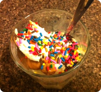 Eating peanut butter sundaes to make us feel better about the mishap: priceless.