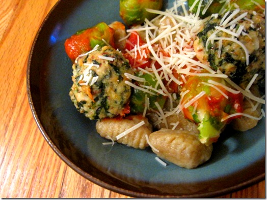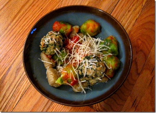 I froze almost all of the meatballs, but I obviously had to implement some into my dinner last night. I ate two atop a bowl of sweet potato gnocchi, brussels sprouts, and marinara sauce…with a sprinkle of more cheese, naturally.