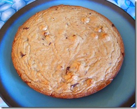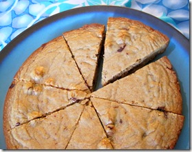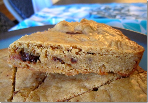 My mom is visiting for the day/night, so I decided to bake a batch of blondies. Since I didn’t have any cake mix on hand, I used another one of my favorite blondie recipes, with an add-in of crushed dark chocolate pieces. And since I don’t have an 8×8 pan, I used a cake pan instead. The result was what appeared to be a giant cookie pie.
