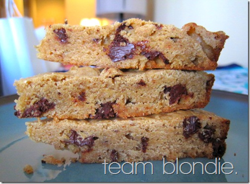 I think we’re on all the same teams…Conan…Edward…and blondie! My mom makes these ridiculous blondies with dark chocolate, coconut and dried cherries…they are SO good! Gooey and full of stuff!!Go Team Blondie!