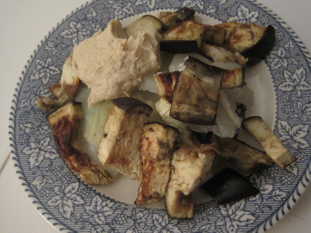 Today has been another fly-by day. Even though I was still completely stuffed from my ginormous lunch, I snacked on some roasted eggplant and steamed cabbage topped with hummus.