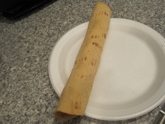 ). And it was super easy. First I spread two spoonfuls of almond butter on a Flatout Wrap (any wrap or tortilla would probably work). Then I topped with some mashed banana and dark chocolate chips.