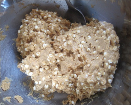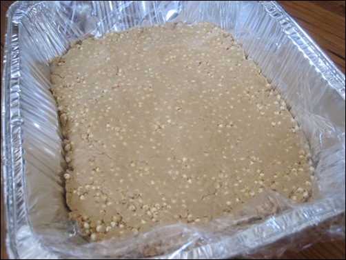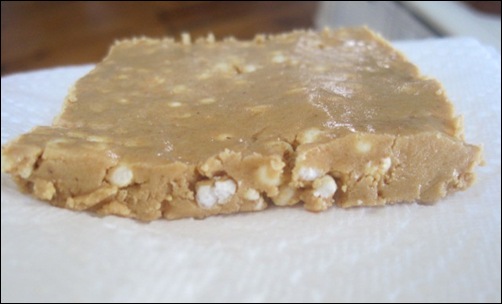 directions: Line a cake pan (or broiling pan, in my case) with plastic saran wrap. In a separate bowl, mix together the peanut butter, protein powder, and coconut flour until well combined. Mix in the millet puff cereal.