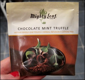 I sometimes drink tea throughout the day, but I almost always drink it right before going to bed (decaf, of course). My favorites are peppermint and green tea, but lately I’ve been all about big mug of Mighty Leaf Chocolate Mint Truffle.