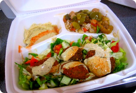 For less than $8, I got a pretty hefty platter of falafel, veggies, rice, and hummus, with some pita bread on the side. Not too shabby!