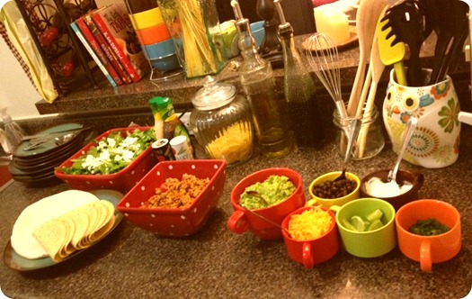 I was in charge of the cooking, so I decided to go with something easy yet delicious and fun to eat. And what’s better than a taco bar? I whipped up some turkey taco meat, a big salad, and a bunch of assorted sides and toppings.