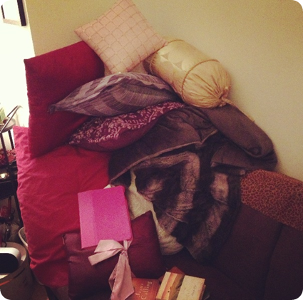 And now here I am – just having finished some pumpkin pancakes courtesy of my BFF Jessi – and prepping to get the day started. I might even be a rebel and leave my bed unmade today. Good thing I have a futon to store my 92465947 pillows…